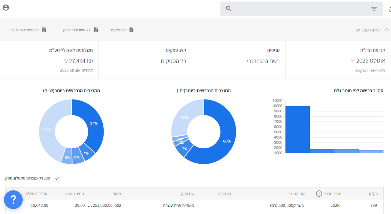הדוח מציג את הכמות הנרכשת של המוצרים ואת מחירם הכולל בתקופת הזמן שהגדרנו.