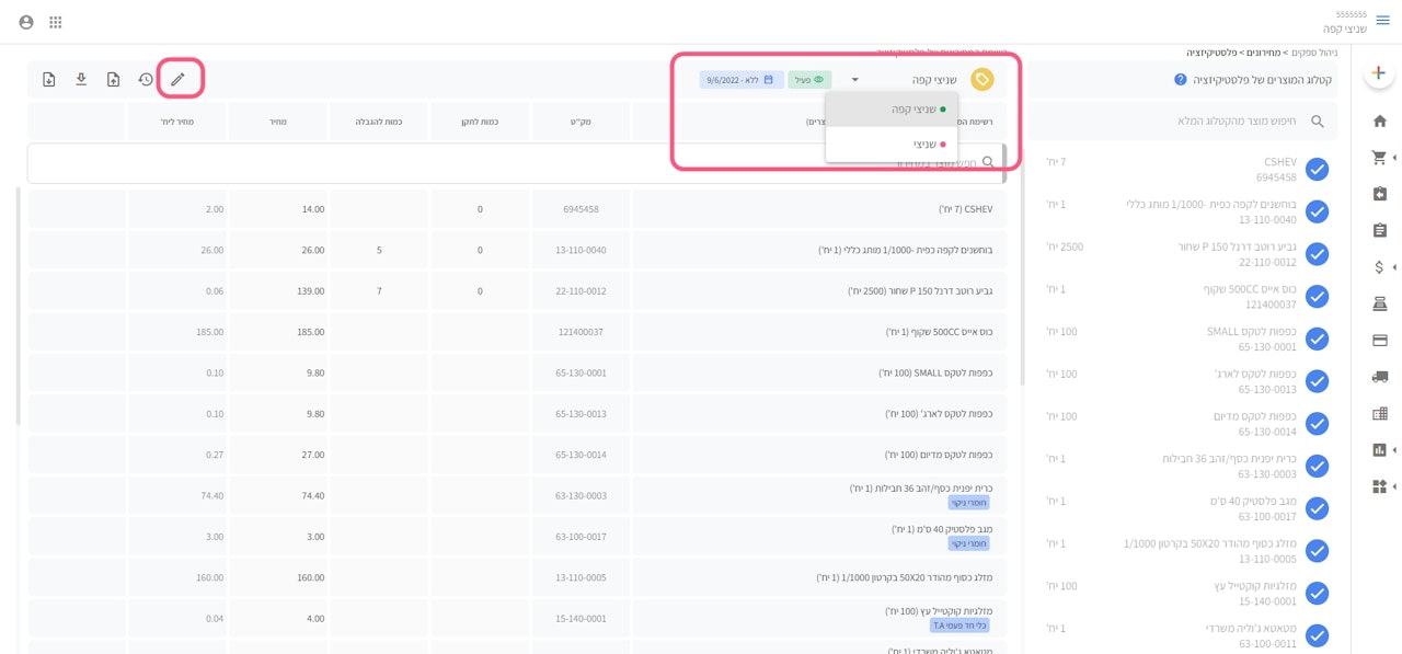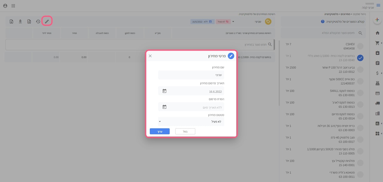 במידה והמחירון אינו פעיל ניתן ללחוץ על סימן העיפרון ולערוך את ההגדרות של המחירון כולל תאריך תוקף.